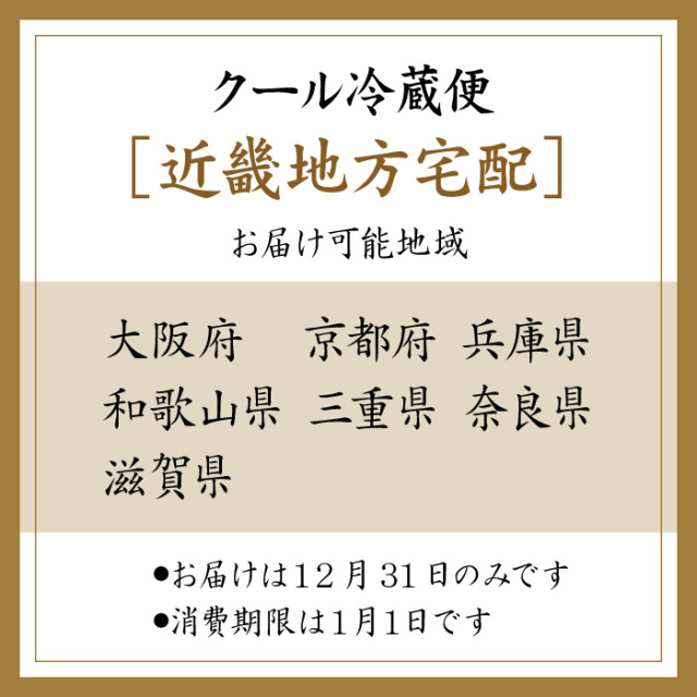 おせち料理の消費期限は1月1日です。お届け先にて対面で必ず12月31日にお受け取りいただけるように、ご注文者さまで予めご確認ください。