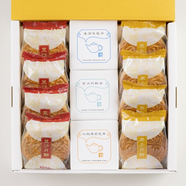 銀座アスターセレクトの香り高い中国茶3種類と月餅4個、栗月餅4個の詰め合わせです。